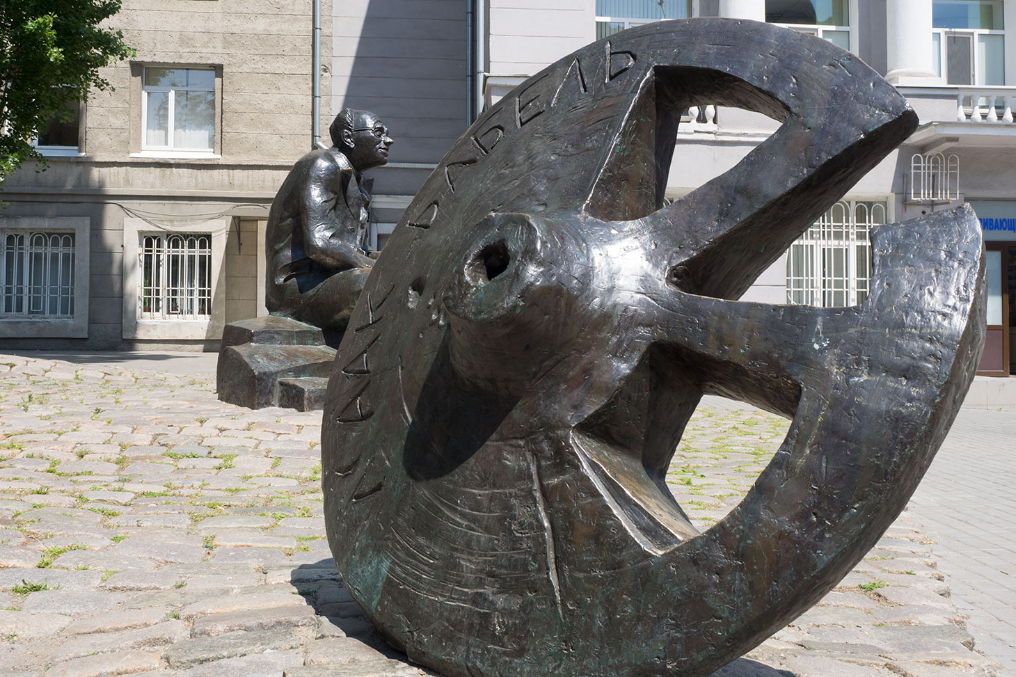 Moldavanka is a shadow in all Odesa stories, and that district’s scullions and satirists populate the streetscapes of the Odesa imagination. And not merely the imaginary streetscapes, but also the city park on Deribasovskaya where a lone empty chair recalls the fictional entrepreneurial conman Ostap Bender, created by Odesa authors Ilya Ilf and Yevgeni Petrov. Bender stands centre stage in two novels by Ilf and Petrov: The Twelve Chairs and its sequel, The Little Golden Calf. Leonid Utesov is there in the same park: relaxed, smiling, a great statue cast in bronze on a park bench, encouraging all who pass to come and sit beside him for a chat.